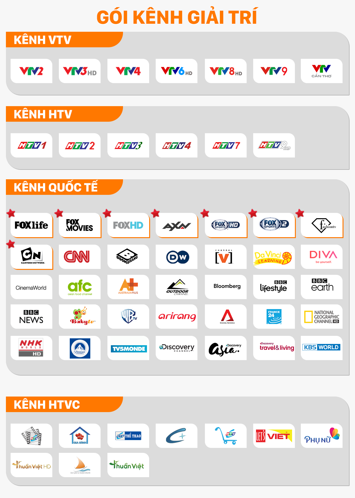 Gói kênh giải trí gồm hệ thống các kênh VTV, HTV, HTVC và kênh quốc tế như: VTV8 HD, HTV2, BBC earth, KBS World, BBC News… Gói kênh này chủ yếu là các kênh giải trí, phim truyện nước ngoài, gameshow truyền hình, ca nhạc, mua sắm… Gói kênh này phục vụ chủ yếu là những người trẻ với mức phí 50.000 đồng/ tháng.